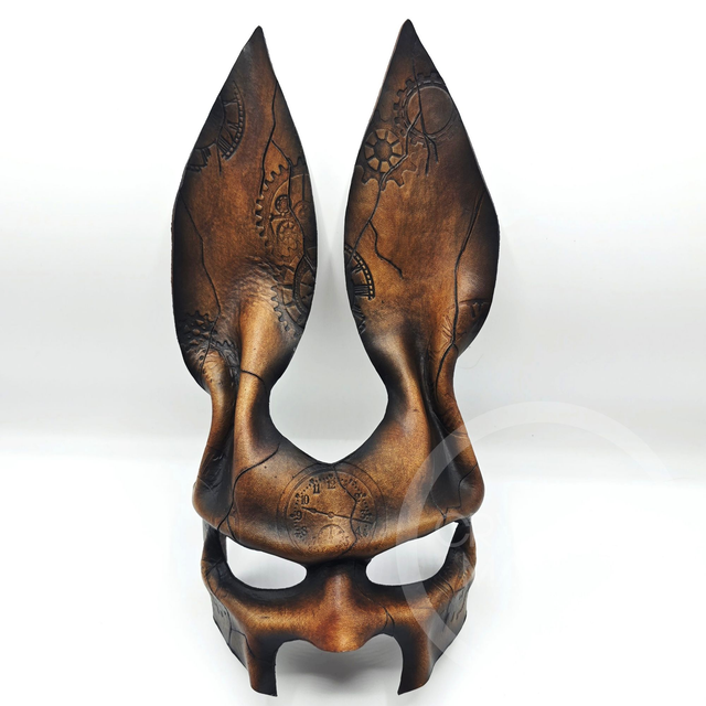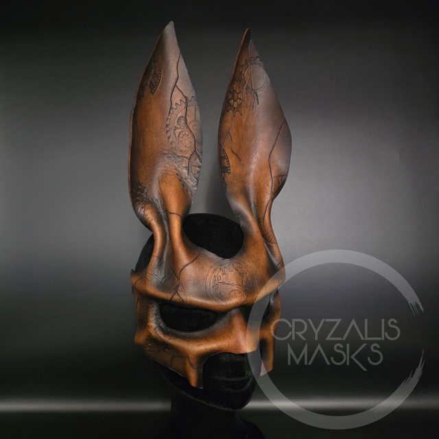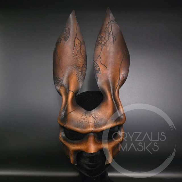 A beautifully crafted leather steampunk Stag mask with a clockwork pattern. I also created each stamp to ensure that all my masks stay unique.