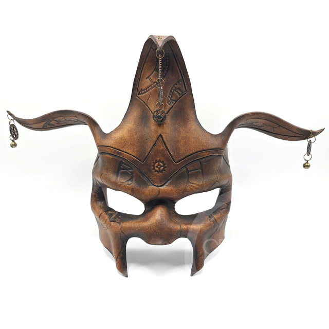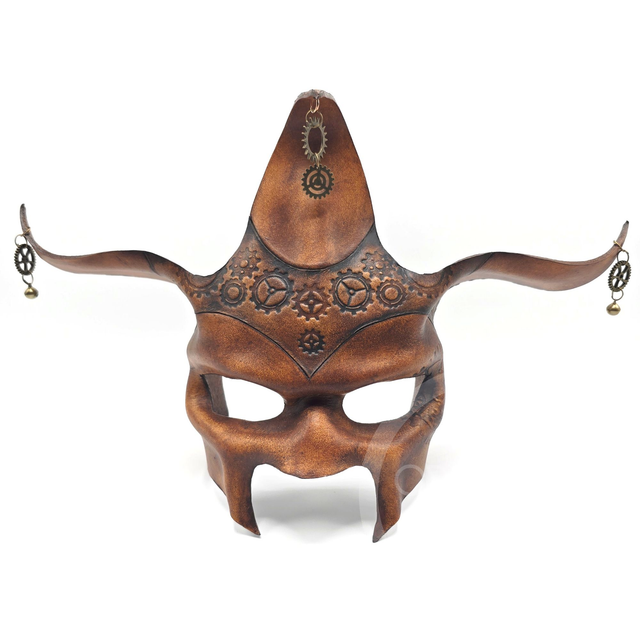 Steampunk Harlequin mask, made from 2.5mm natural leather with a clockwork design throughout. The mask has been finished off with bronze coloured jingle bells and bronze coloured cogs.